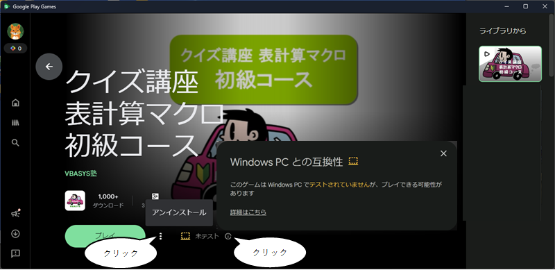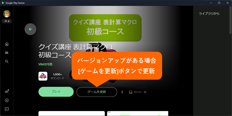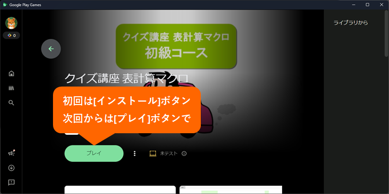 PC版 Google Play Games の[探す]ボタンより "vbasys" や "マクロ" や "表計算" などで検索し、アイコンをクリックします。