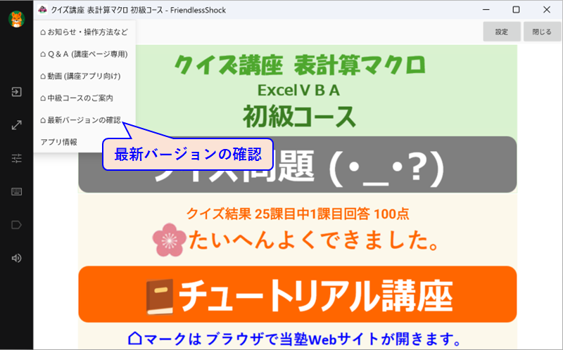 クイズ講座アプリの[オプションメニュー]-[最新バージョンの確認]で最新バージョンの有無を確認できます。