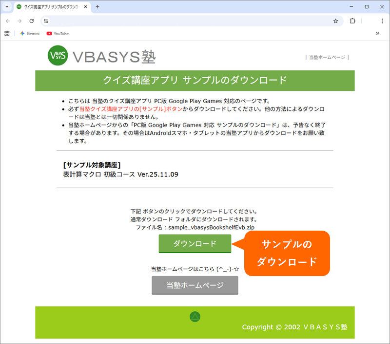 クイズ講座アプリの[サンプル]ボタンをクリックすると、ブラウザより当塾ホームページの[クイズ講座アプリ サンプルのダウンロード]ページが開くので、[ダウンロード]ボタンをクリックします。