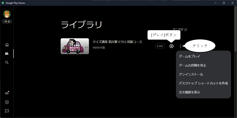 アプリが表示され、左側に[プレイ]ボタンとオプションメニューからは[アンインストール] [ディスクトップショートカットを作成]などがあります。