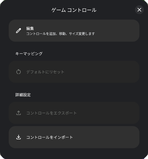 ウィンドウモード中 ゲームウィンドウの左側にある「ゲームコントロール」をクリックするとゲームコントロール画面を表示します。